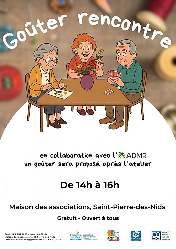 Nous avons le plaisir de vous proposer, chaque mois, deux goûters rencontres à Saint-Pierre-des-Nids, organisés le mardi. Ces événements sont mis en place par l'EVS (Espace de Vie Sociale Le Puzzle), en partenariat avec l'ADMR.